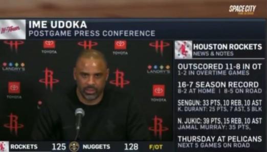 北京时间今天,NBA常规赛中,休斯敦火箭队在客场加时赛中以125-128不敌丹佛掘金队。赛后,火箭主帅乌杜卡在新闻发布会上批评了三名裁判的判罚。乌杜卡说:“我认为这场比赛裁判的表现确实不太好。总的来说,我认为这场比赛的判罚非常糟糕。两名经验不足的裁判没有资格主持这场比赛,而且主裁判看起来就像一个追星的球迷。所以你可以看到各种不一致的判罚,我确信我应该收到一张罚单。”记者:“像今晚这样的比赛,罚球的时候你怎样才能拯救你的球队呢?”我们只需要保持自己的风格。因此,由于裁判不好,我们将继续做我们必须做的事情。希望他们能够调整,做出正确的判罚。”本场比赛,火箭队和掘金队的犯规比为25-28,罚球比为26-33。