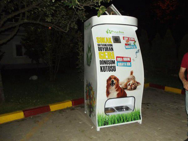 对于保护流浪猫狗的热爱动物的人们来说这真的是一个特别棒的机器。这款机器是由土耳其公司Pugedon发明的,他们承诺不会向政府收取费用,现在已经在土耳其街头、公园等公共场所投放许多这种自动贩卖机,只要有人将可回收的塑料瓶投入进去,那么那些流浪猫狗就会拥有食物和水,这样它们就可以一直生存直到等到有主人认领自己。另外,这种机器还可以倡导人们保护环境,减少街道垃圾。